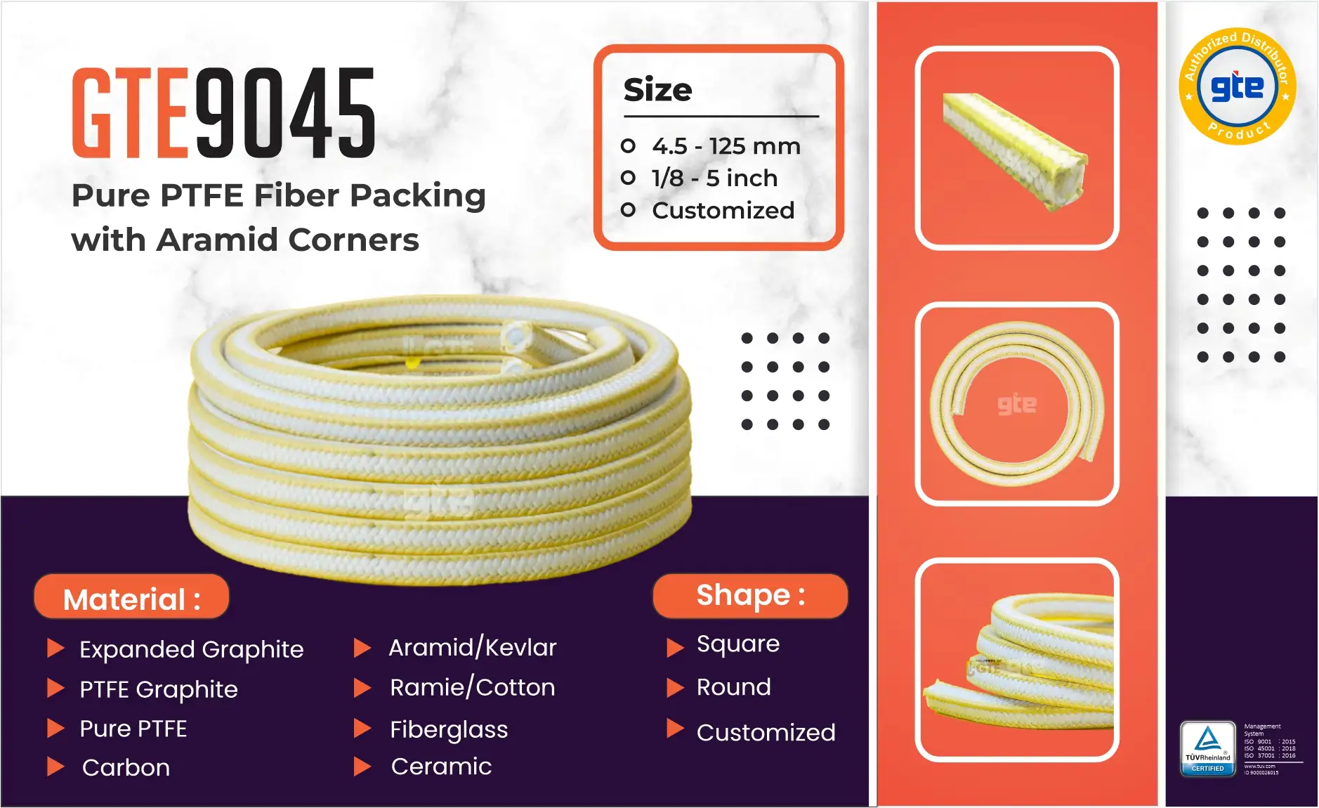 PTFE PACKING WITH ARAMID FIBER CORNERS IS A MULTI-YARN PACKING, THE CORNERS OF PACKING ARE MADE OF ARAMID FIBER YARNS. IMPREGNATED WITH PTFE, THE FRICTION FACES ARE MADE OF PURE PTFE THREAD. IT IS PRE LUBRICATED WITH SILICONE OIL.